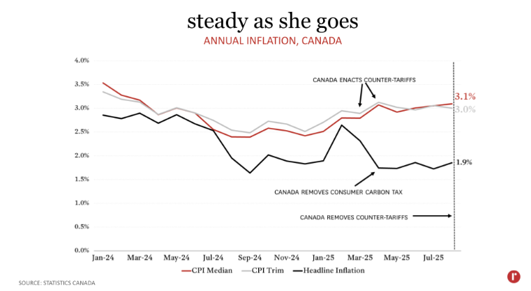 It appears that growth in core measures of inflation has moderated in recent months, as evidenced by the 6-month annualized calculations (2.8% for both CPI Trim & Median) and the 3-month annualized calculations (2.6% for CPI Median & 2.4% for CPI Trim). One contributor to rising prices in April was likely Canada’s implementation of counter-tariffs on the United States in March and April, which were otherwise masked by falling energy prices. Prices for some goods that were tariffed rose on a month-to-month basis in April, including household appliances (+1.2%), household tools (+0.7%), and audio equipment (+0.7%). Canada has since (as of September 1st) removed all counter-tariffs for CUSMA-compliant goods with the exception of steel, aluminum, and autos. To the extent that the counter-tariffs had put upward pressure on prices here in Canada, there is potential for price reductions in the next release of the CPI as counter-tariffs are lifted.