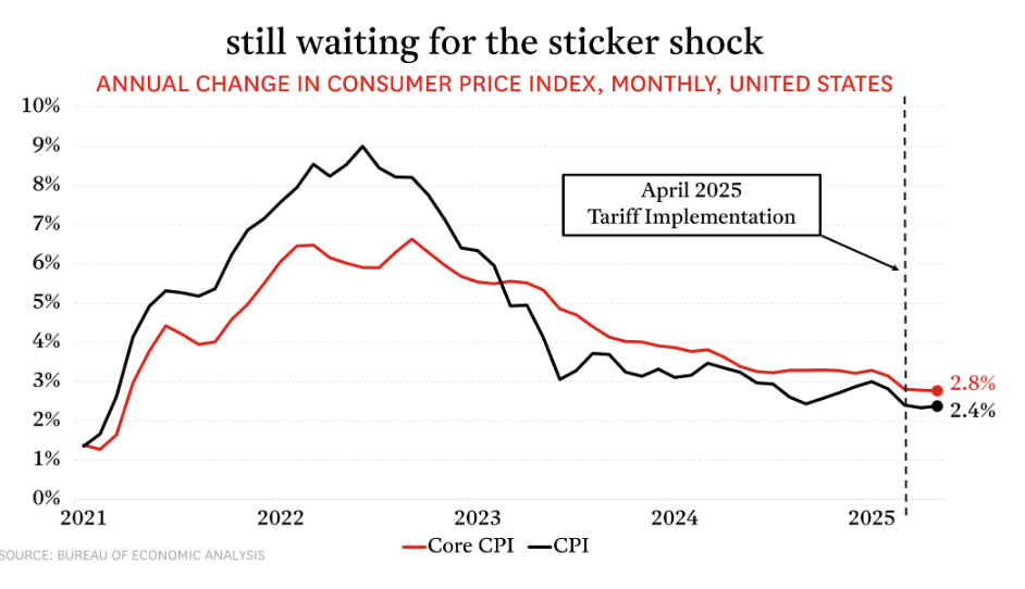 Given the unpredictability of tariff policy so far, it seems that businesses are first working through inventories purchased at this lower cost basis. Many firms may be holding off on raising prices until they must, in the hope that the tariffs prove short-lived.