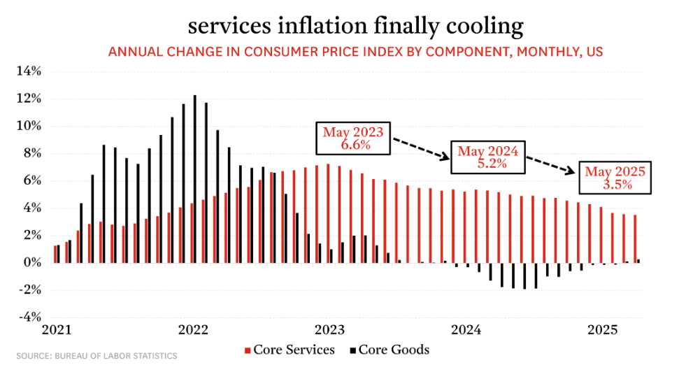 Increases to services costs, which include things like housing, insurance, and medical care, have been the major contributor to inflation since 2023. Services are naturally slow to cool, but they are indeed cooling. Near the peak in May 2023, annual services inflation was at 6.6% and, last month, it had cooled to 3.5%, which is helping to bring down the overall inflation reading.