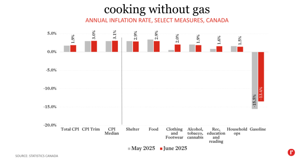 Shelter inflation slowed further in June, and fell to its lowest level in more than four years. Food, household operations, and alcoholic beverages, tobacco products and recreational cannabis categories likewise all saw their annual inflation rate decline in June. Notably, clothing and footwear, which relies heavily on international trade, saw its inflation rate increase last month, as did recreation, education, and reading, which includes some goods from the United States on which Canada has placed counter-tariffs (like sports equipment and audio visual equipment).
