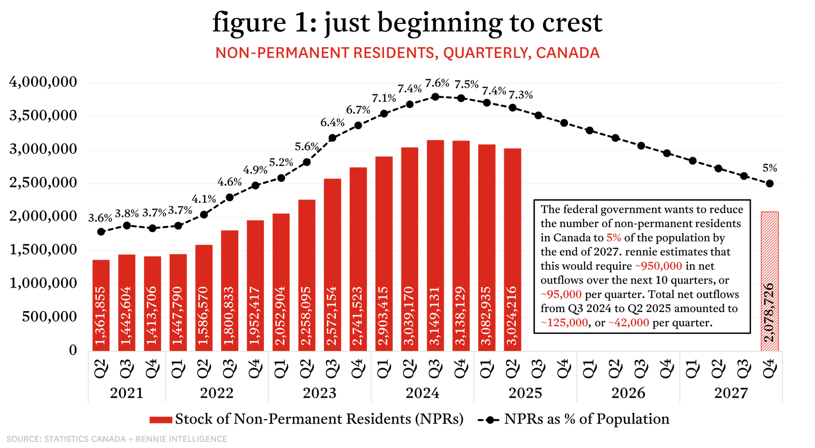 Figure 1 highlights the evolution in Canada’s non-permanent resident population to-date and what it will take to meet the revised 5% target. Since peaking at 3.15 million people in Q3 2024, the number of non-permanent residents in Canada has only declined by 125,000 through the middle of 2025, for an average of 42,000 per quarter since the peak. This has brought their share of the national population down marginally, from 7.6% to 7.3%. Leveraging rennie’s in-house population models, we estimate that meeting the 5% target by the end of 2027 would require additional net outflows of approximately 950,000 non-permanent residents over the next 10 quarters, equivalent to 95,000 per quarter. Therefore, even with an extra year to meet the 5% target, the pace of outflow will have to more than double from what has heretofore been an unprecedented outflow over the past three quarters.