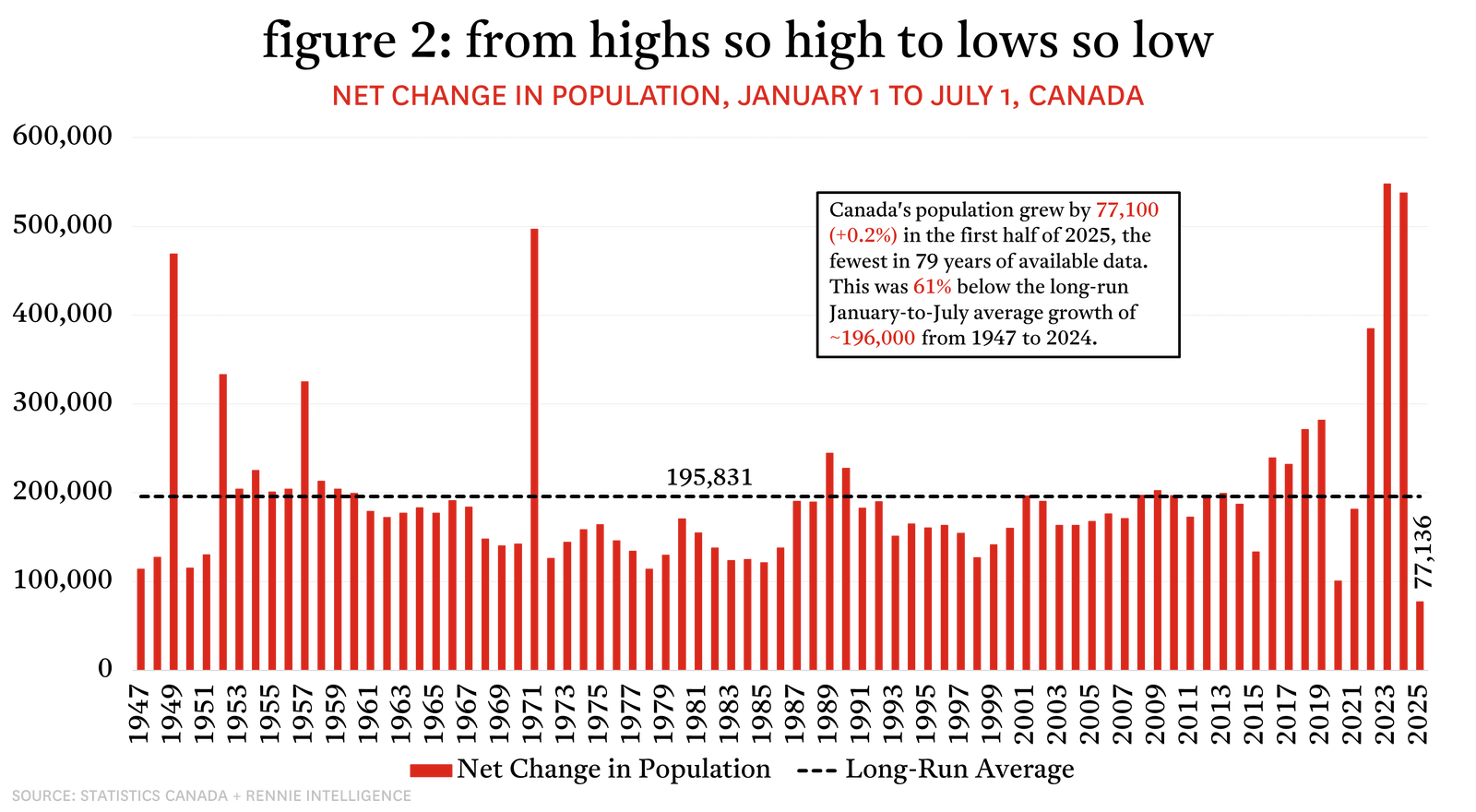 Despite little progress having been made thus far in reducing the number of non-permanent residents in Canada, the net outflows experienced to-date have already led to a dramatic deceleration in Canada’s population growth. The national population reached 41.65 million on July 1st of this year, a net increase of just 47,100 people in the second quarter. This stands in sharp contrast to growth of 272,000 people in Q2 2024, 321,800 in Q2 2023, and 257,100 in Q2 2022. In total, Canada added 77,100 people through the first half of 2025, which, as figure 2 shows, marks the fewest net additions in the first six months of any year in available data back to 1947. Over the past roughly eight decades, national population growth has averaged nearly 196,000 in the first half of the year.